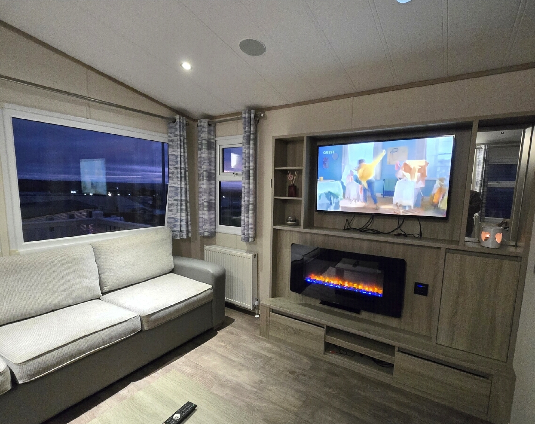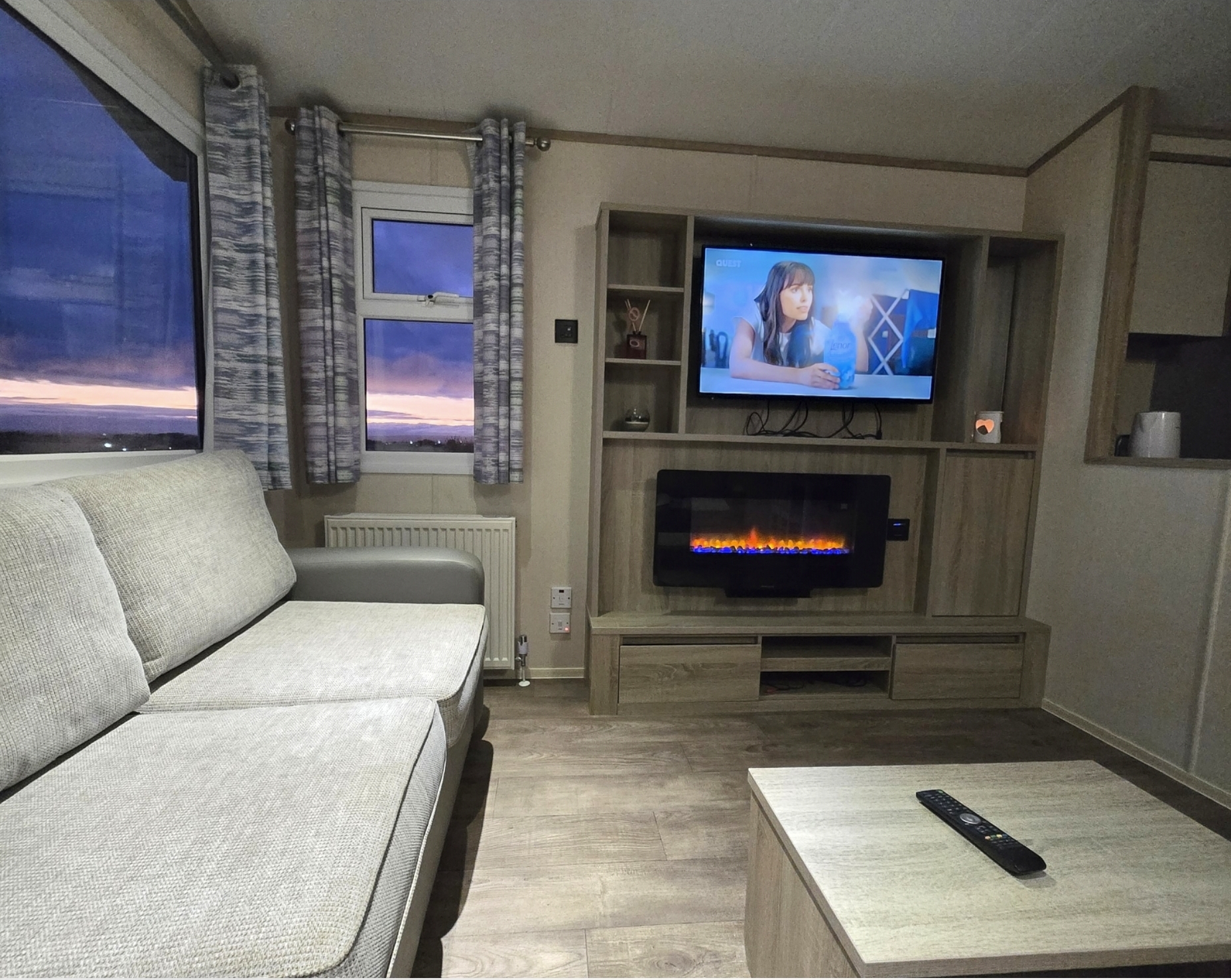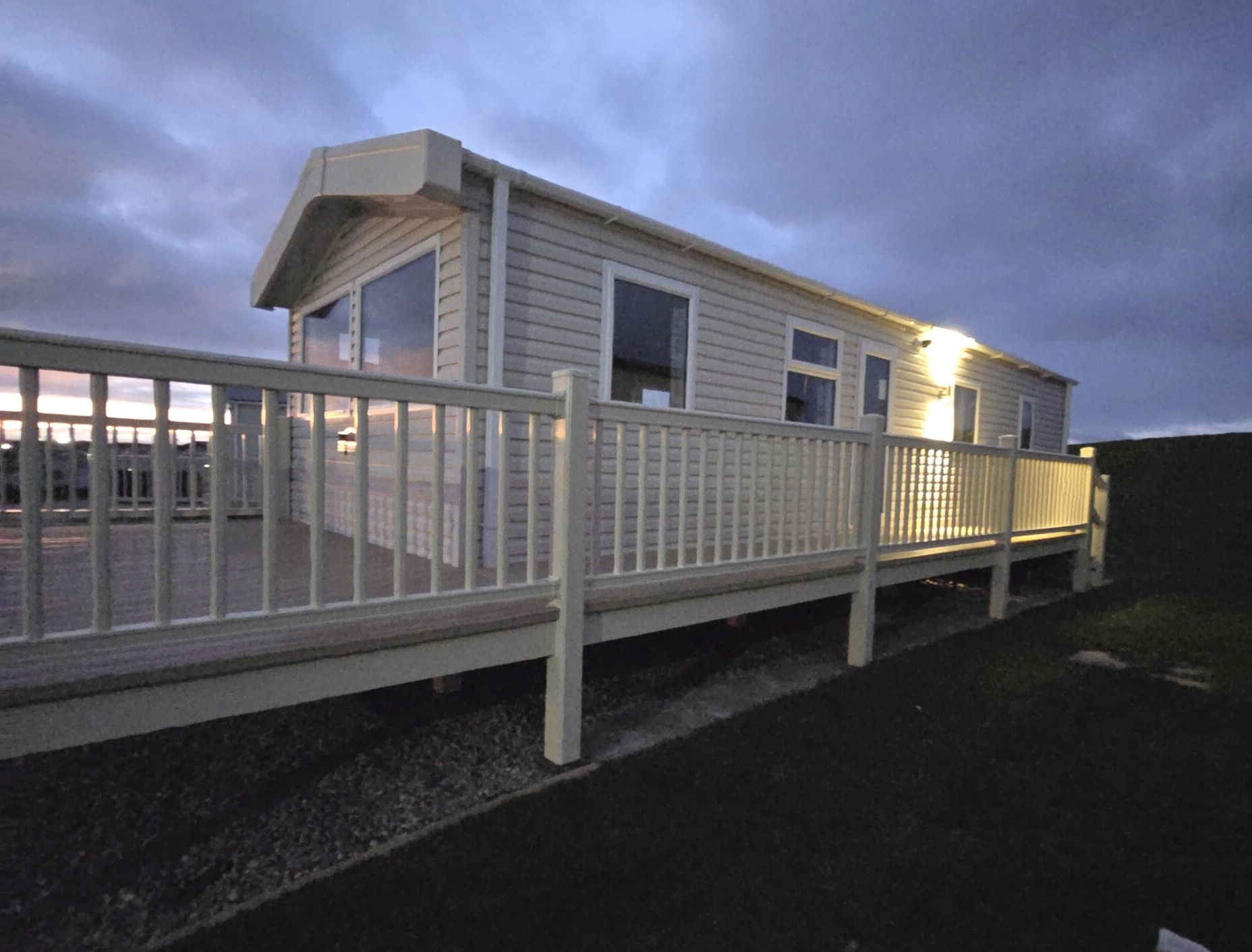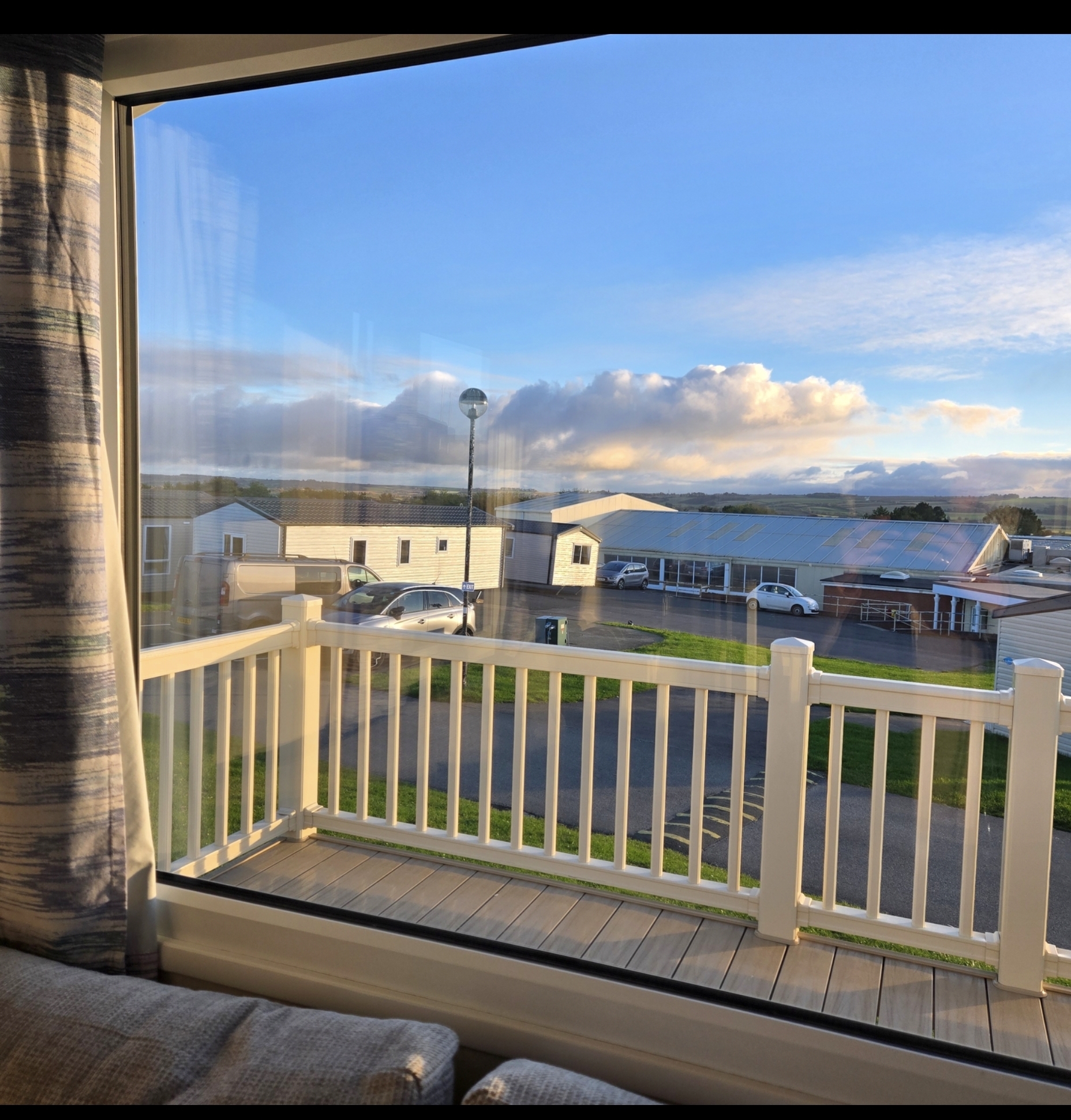 This caravan backs onto the open field . 5 seconds from the door and you have an amazing sea view .