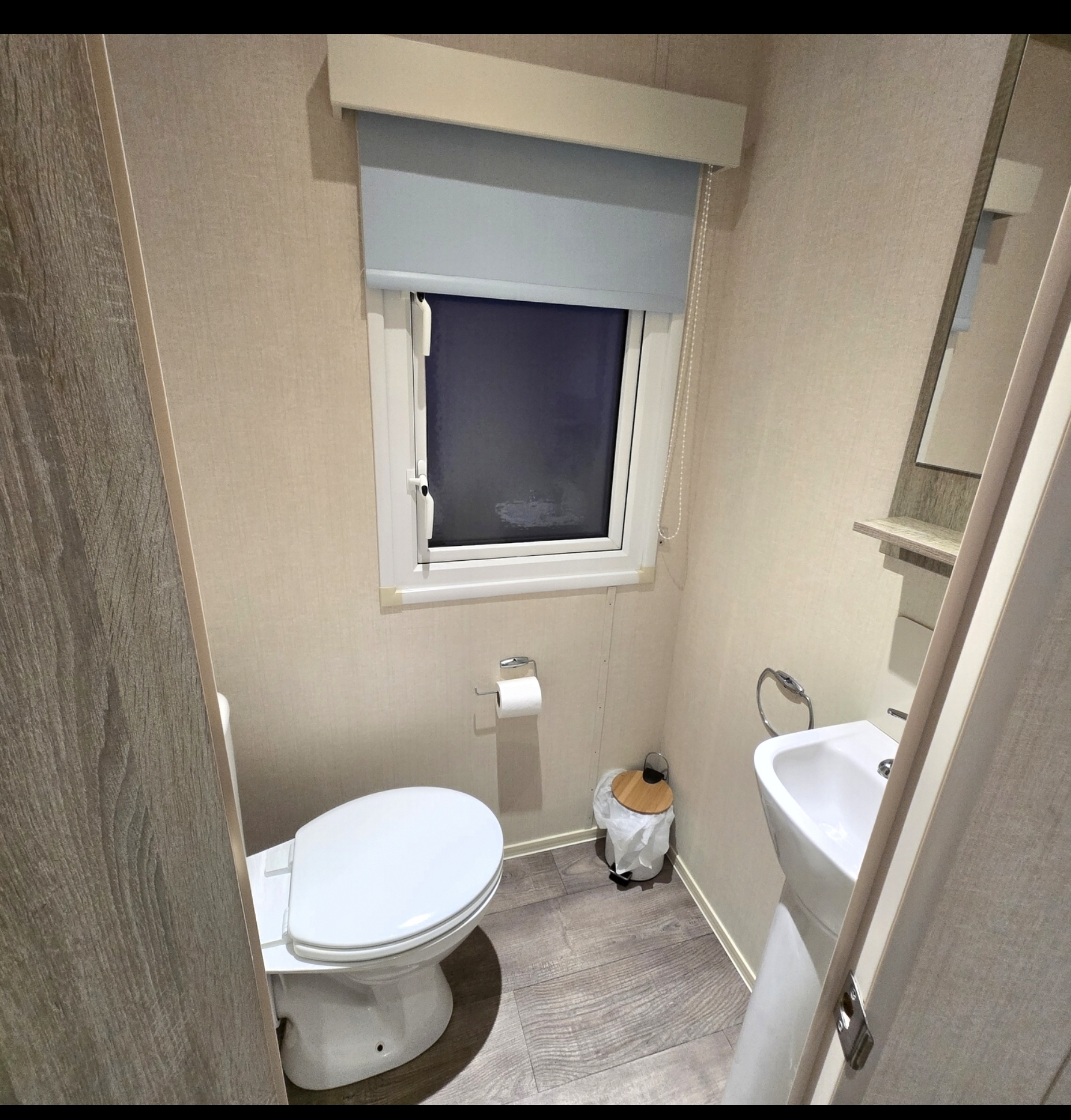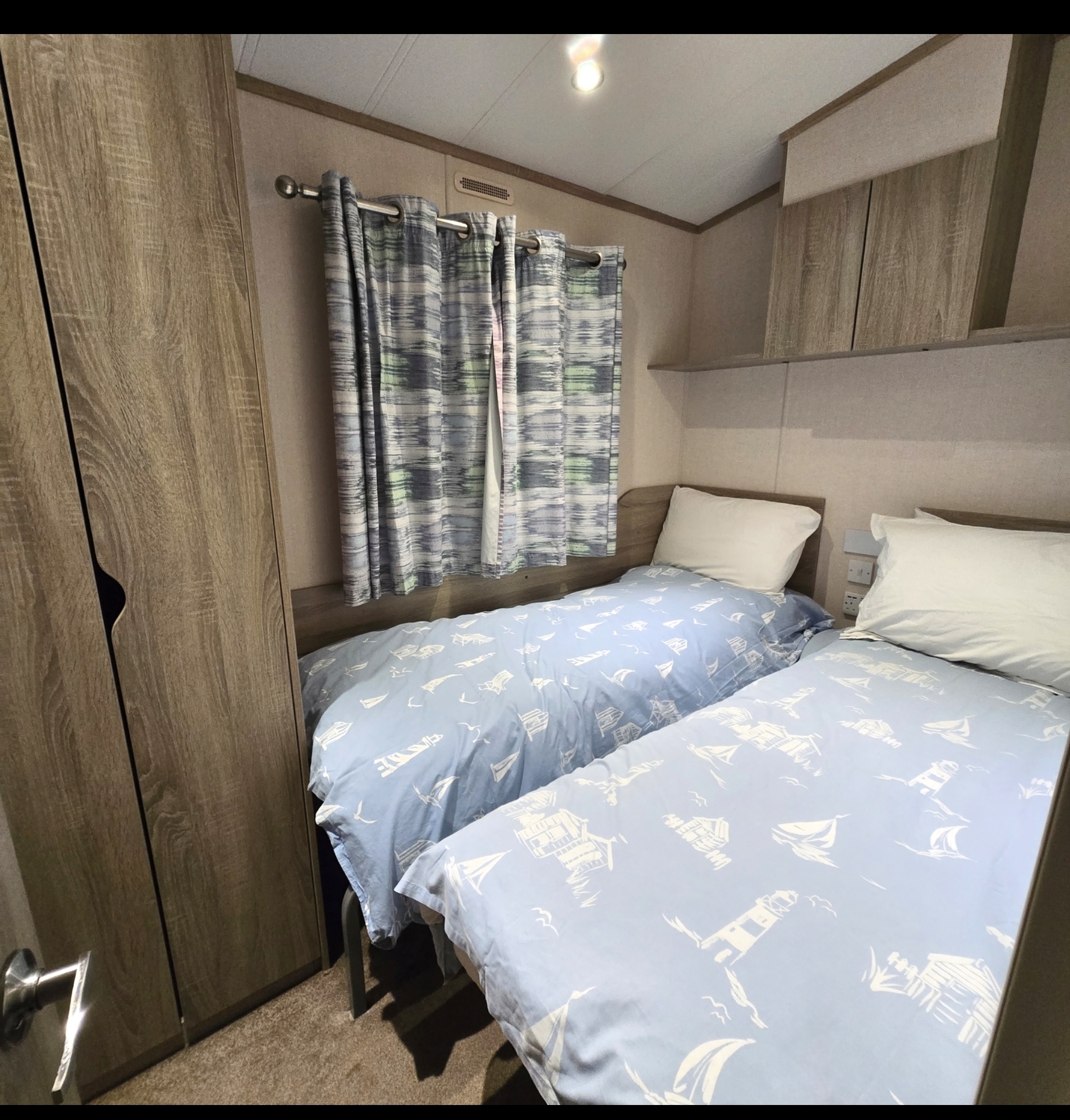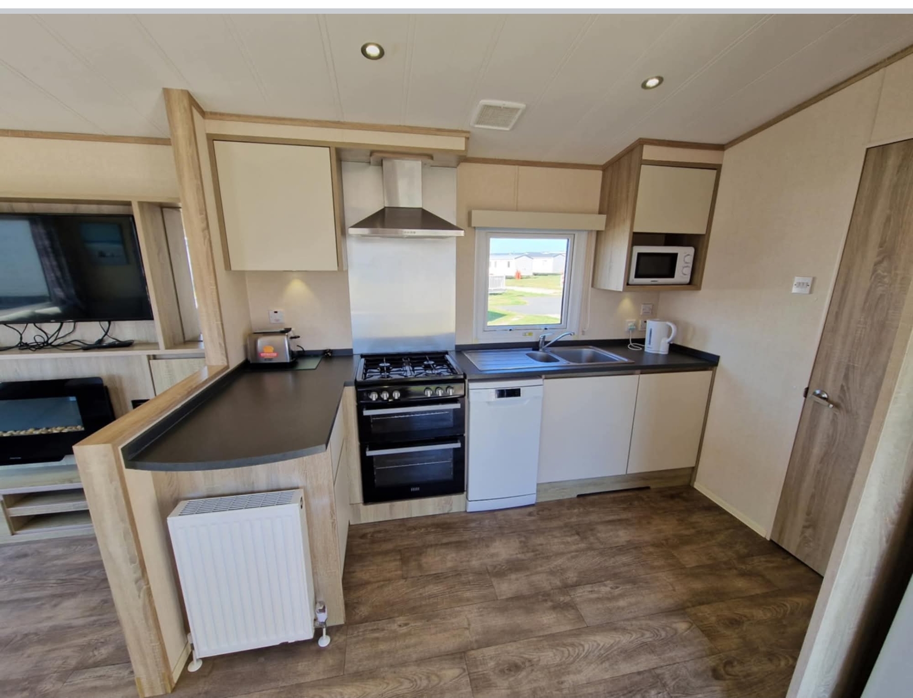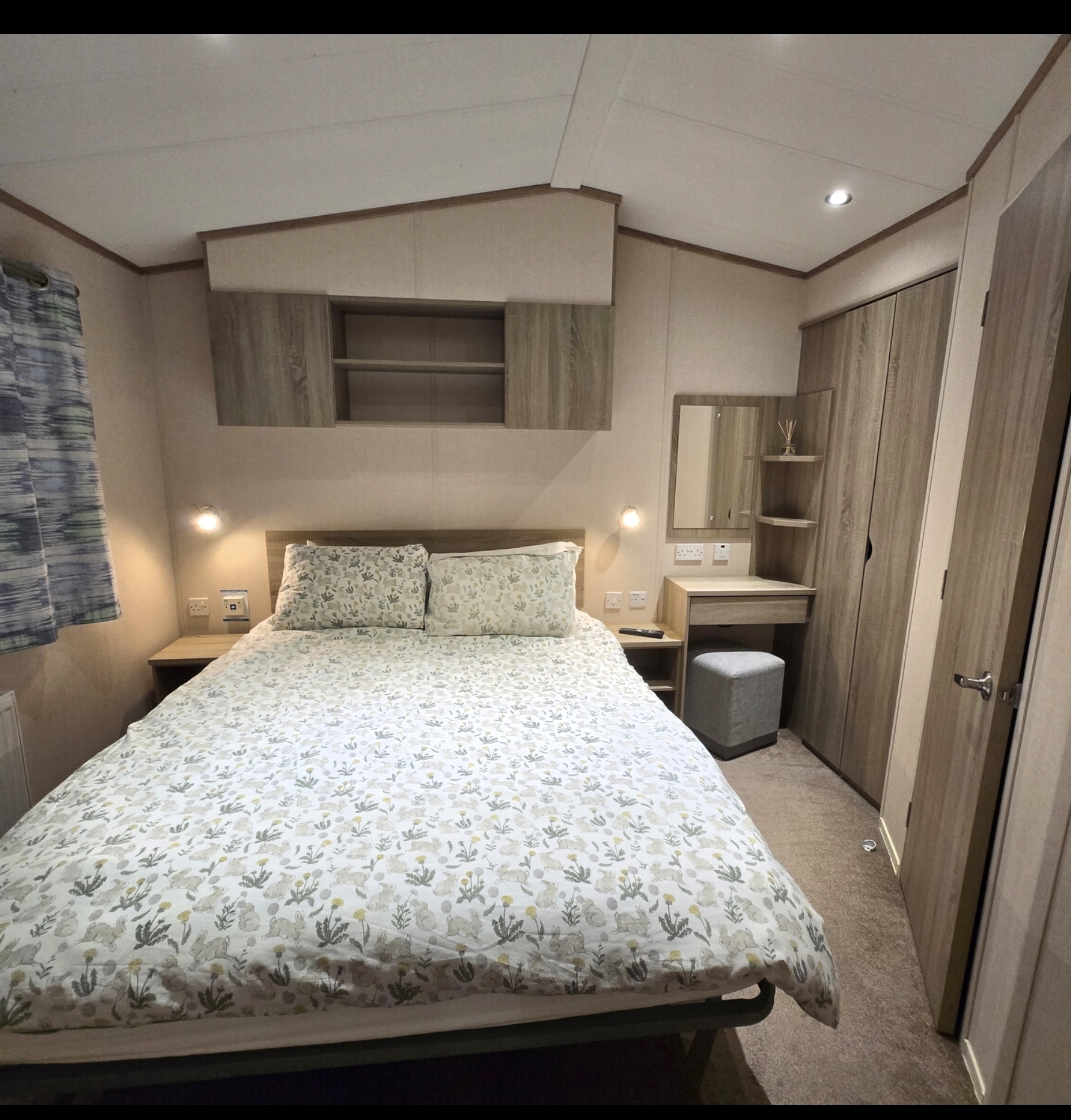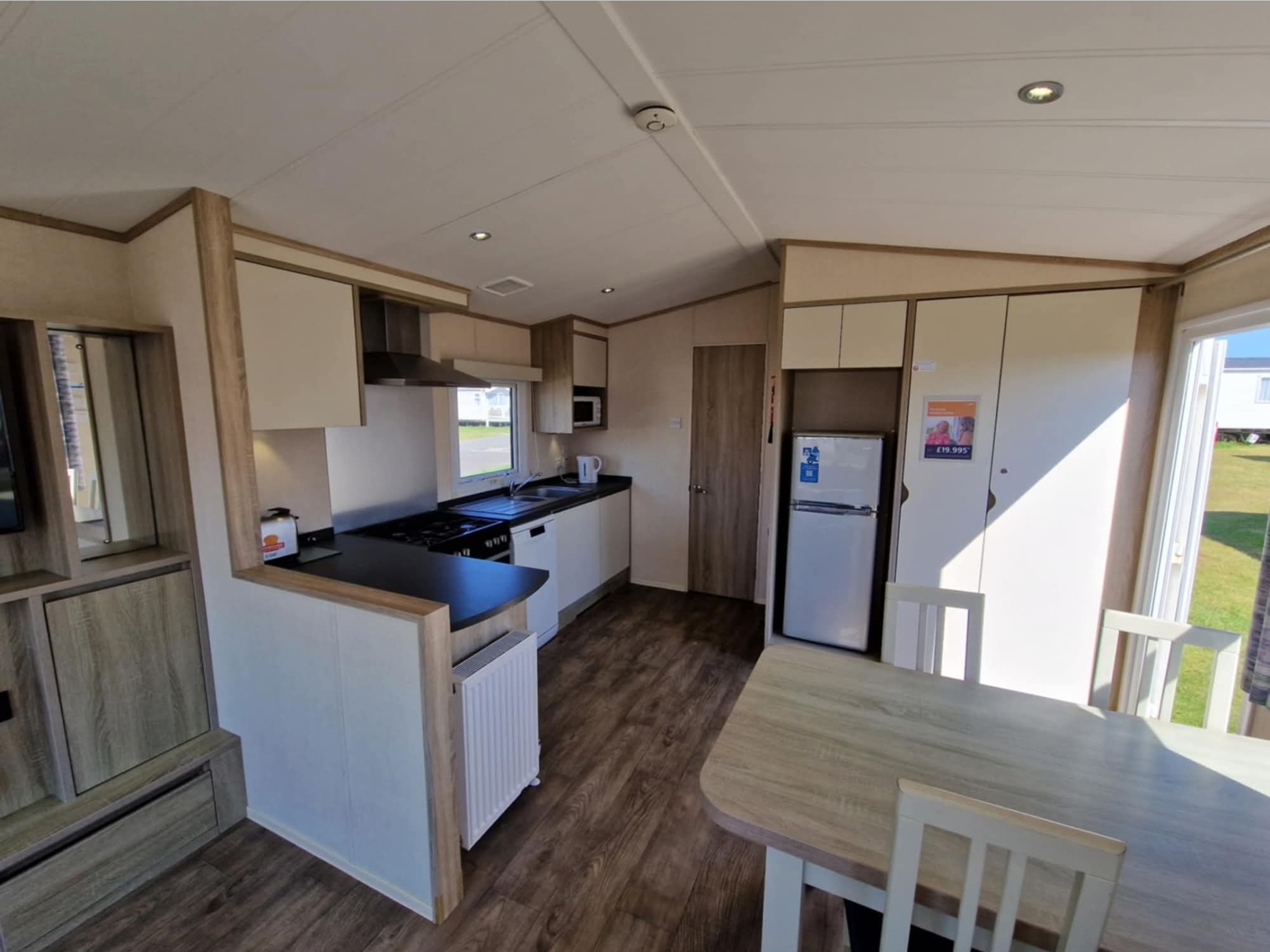 This caravan backs onto the open field . 5 seconds from the door and you have an amazing sea view .