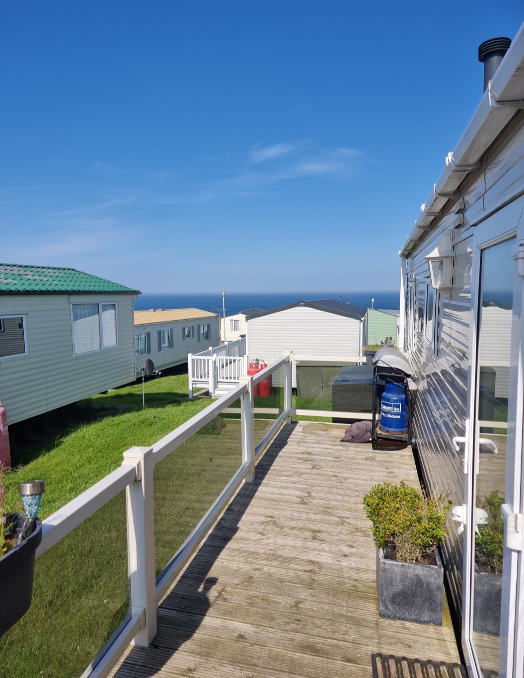 Sited on a quiet part of the park , this caravan is perfect for a peaceful holiday . It has patio doors with a front deck so you can watch the ships sail past .